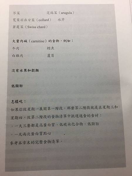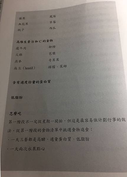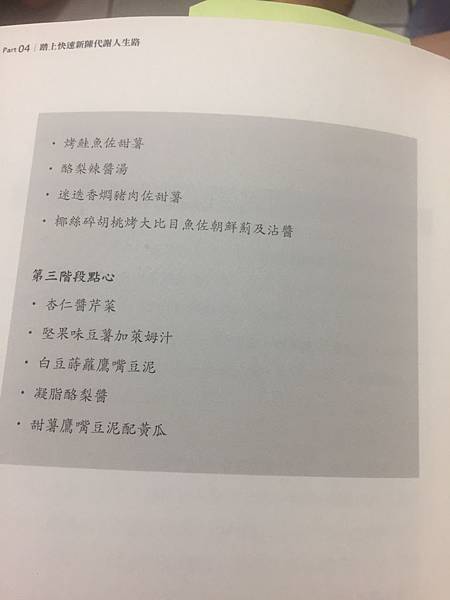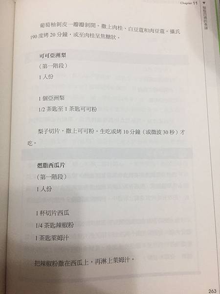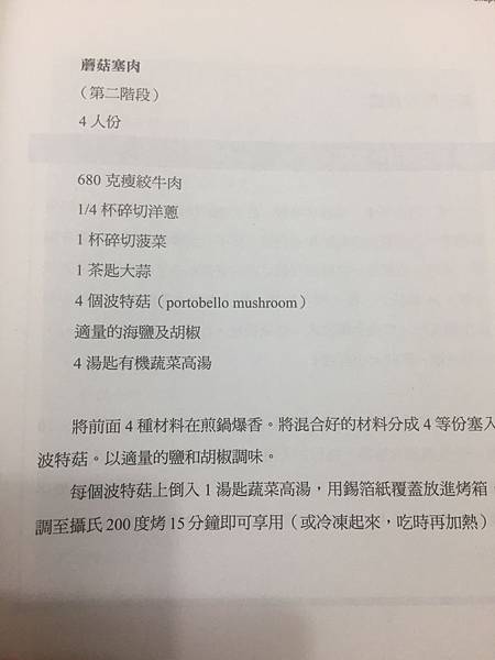 好,暫且不談。來到183頁,是實行一個月之後的第二個月嗎?我努力的、反覆的看了三遍,總算悟出,第183頁至223頁是再講一次那四週該做的事情並搭配食譜,這編排很詭異,我有想摔筆的衝動。